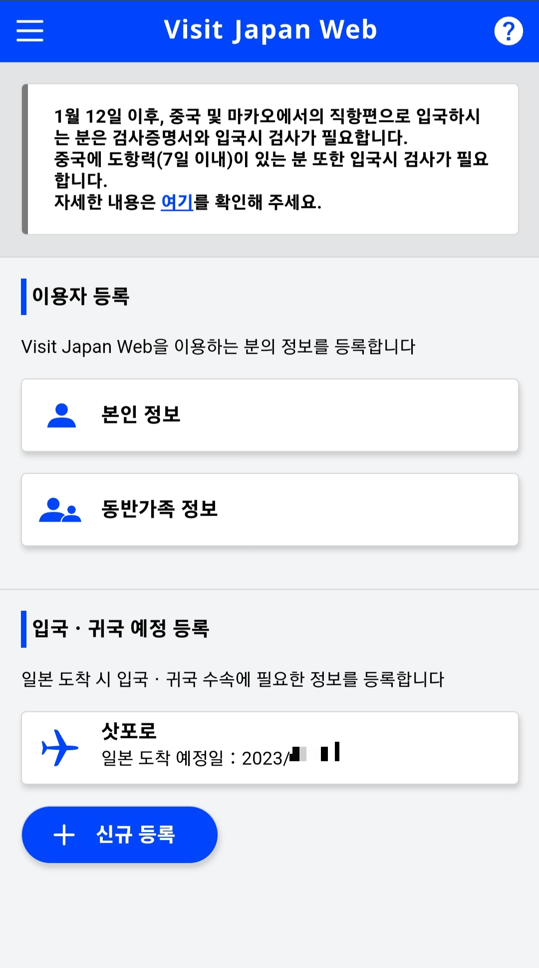 그럼 이렇게 방금 입력한 내용이 아래에 뜨는데 저걸 눌러서 들어가면 검역 수속 사전등록을 할 수 있게 된다.