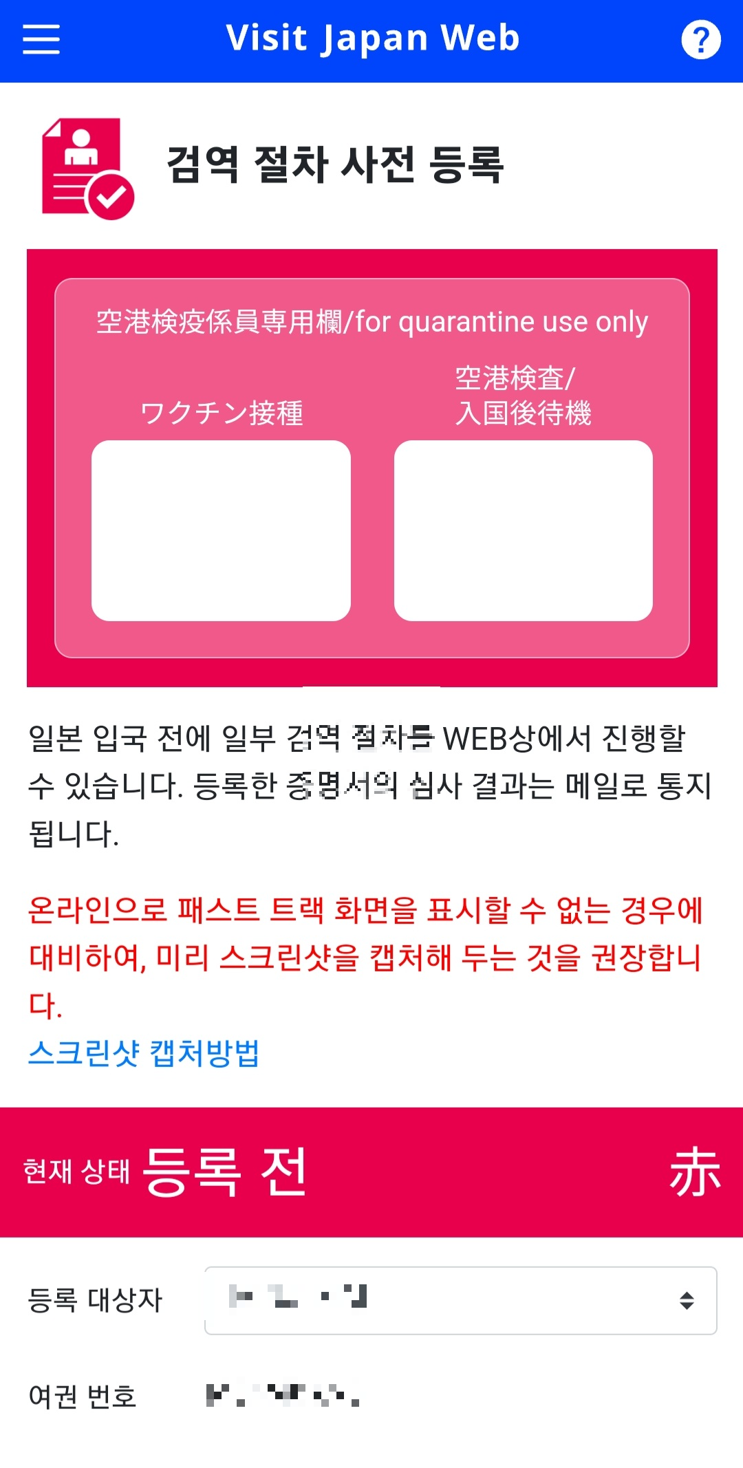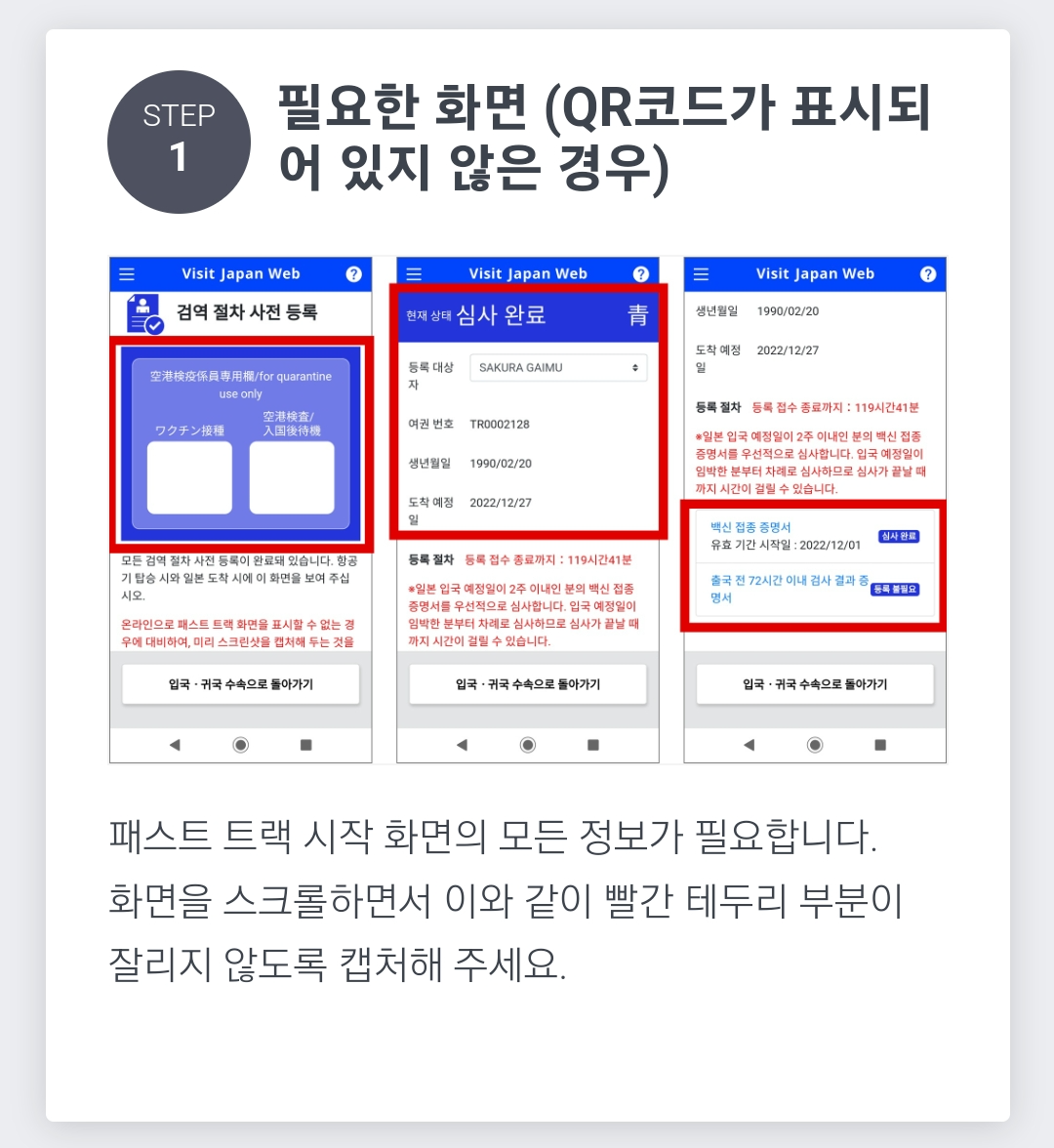 23년부터는 검역 절차에서 QR코드는 표시되지 않으니 오른쪽 사진 내용을 확인해서 캡처할 때 빠뜨리는 부분이 없도록 유의하자.