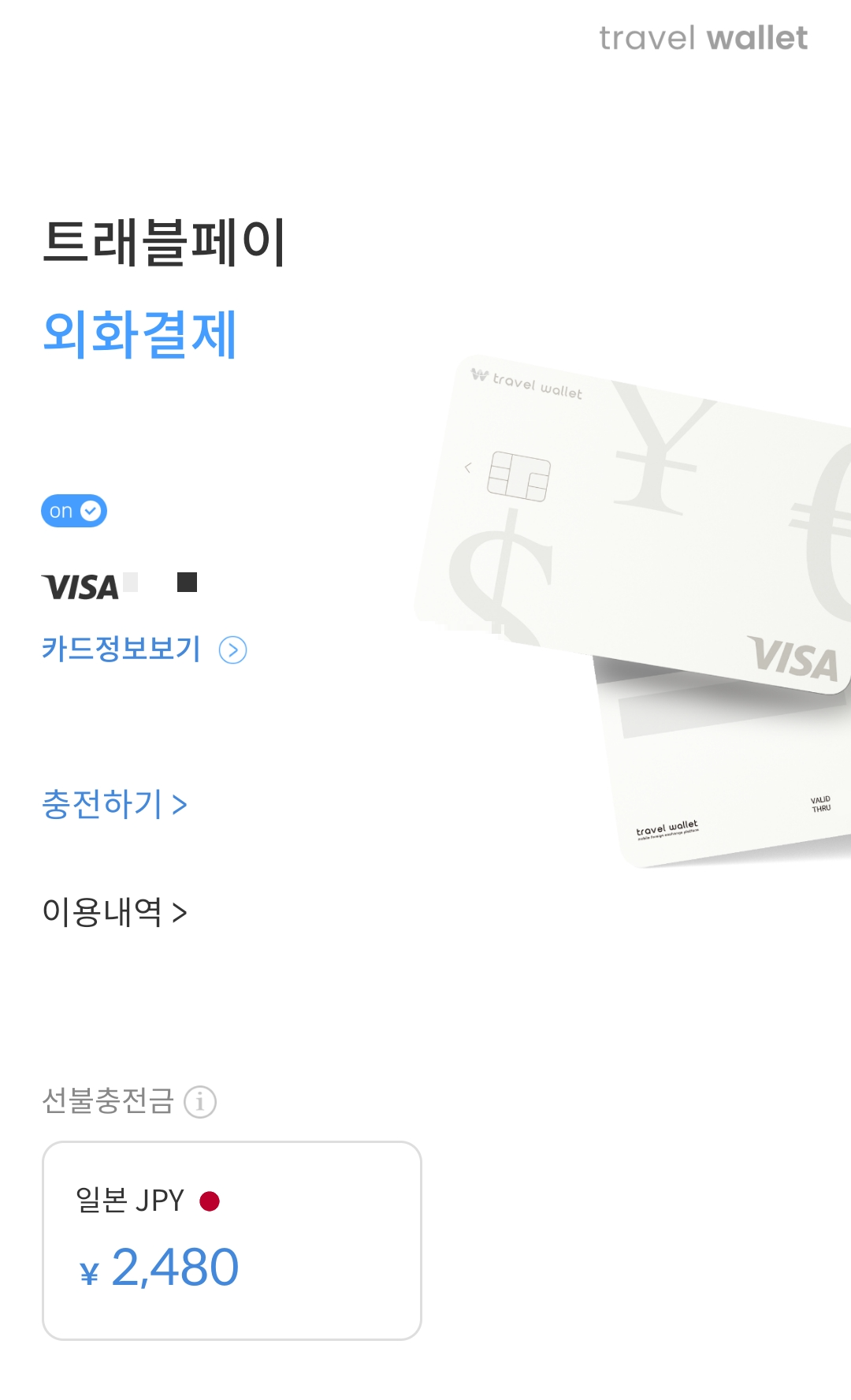 트레블월렛 회원가입하고 실물 카드를 받아 충전해서 사용하면 끝이다. (VISA 카드임)